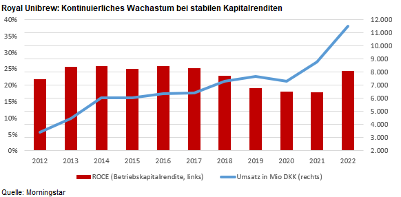 Der dänische Getränkehersteller hat eine wechselvolle Geschichte hinter sich. Nach einer Beinahe-Insolvenz im Jahr 2008 konnte sich das Unternehmen erfolgreich erholen und durch eine überzeugende Neuausrichtung attraktive Renditen für die Aktionäre erwirtschaften. Royal Unibrew hat im Krisenjahr 2022 Fingerspitzengefühl im Umgang mit dem historischen Erbe einerseits und den operativen Herausforderungen andererseits bewiesen.
